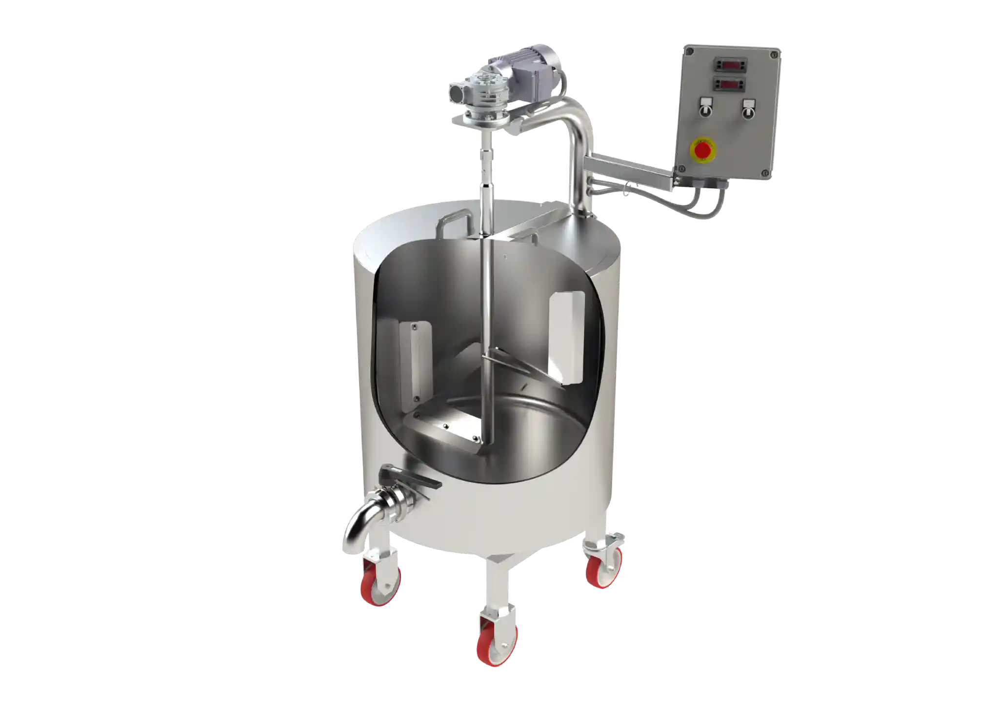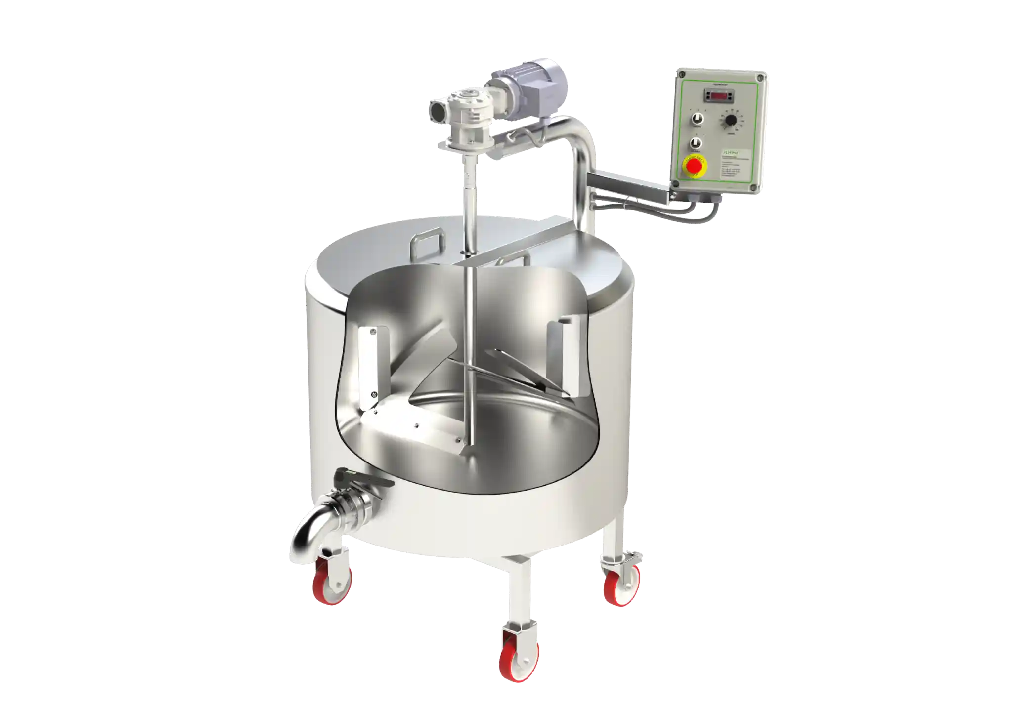 Ausgerüstet mit einem Teflon-Schaber-Rührwerk, wird das Produkt am Boden und an den Wänden kontinuierlich abgestreift. Dies verhindert ein Anbrennen während dem Kochvorgang.